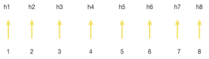 Prenons 8 documents appelés 1 à 8. Puis, hachons-les un par un, et appelons leur hachage h1 à h8.