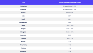 Les données sur la taxation des cryptomonnaies en Asie montrent des écarts significatifs, reflétant des approches variées en matière de régulation et d’attractivité fiscale. Les pays comme Brunei, Hong Kong, la Malaisie et Singapour se démarquent par une absence totale d’imposition, favorisant un environnement attractif pour les investisseurs. À l’inverse, des nations telles que le Japon (15 à 55 %), Taïwan (5 à 40 %), et l’Inde (30 %) appliquent des taux élevés ou progressifs, indiquant une volonté de réguler ce secteur tout en générant des revenus fiscaux. La Chine interdit purement le commerce, optant pour un contrôle strict. Enfin, des pays comme l’Indonésie (0,1 %) et le Vietnam (0 à 5 %) adoptent des taux très faibles, reflétant une approche intermédiaire pour stimuler ce marché émergent tout en maintenant un certain cadre de régulation. Cette diversité illustre l’absence d’une politique fiscale unifiée dans la région.